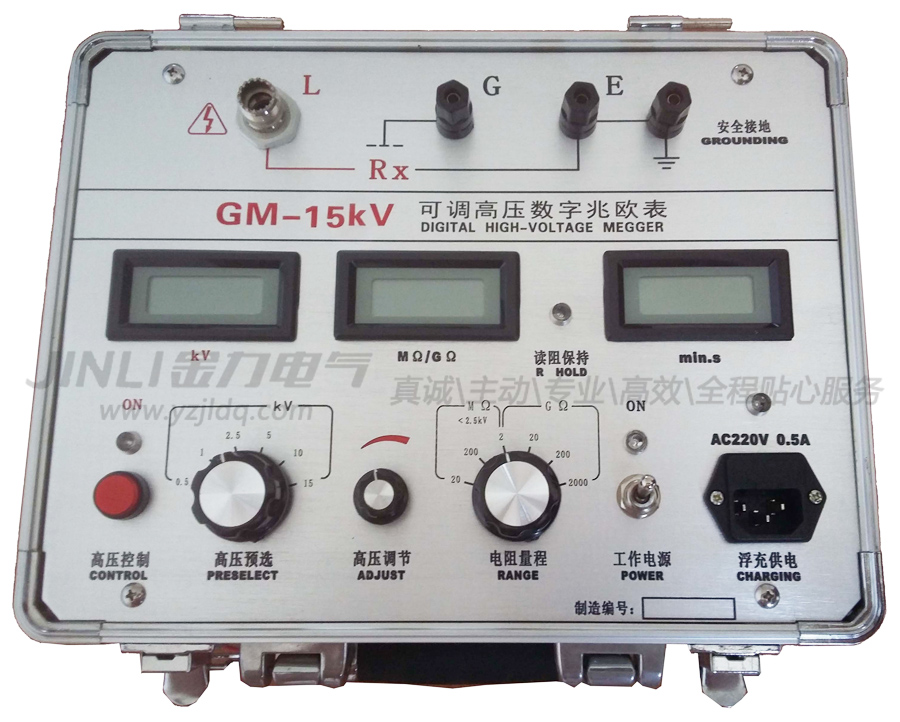 GM-15kV | 0.5、1、2.5、5、10、15kV | ±(5%+10V) | >10mA | 0.01 MΩ~1999GΩ |